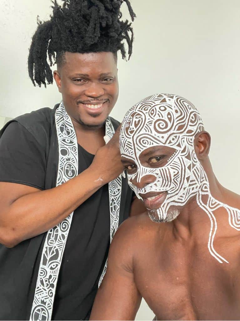 Láolú brought his signature “Sacred Art of the Orí,” a Yoruba-rooted practice centered on aligning with one’s destiny and awakening the divine within. Symbolic patterns representing wisdom, compassion, and liberation were painted onto Djimon’s head, hand, and shoulder, transforming his body into a living canvas.
